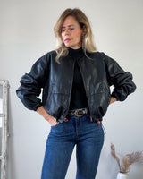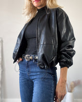 Cazadora negra efecto piel estilo bomber. Bolsillos laterales. Corte amplio y talle corto. Frunce en la cintura. Una prenda con mucho estilo. Forro interior.
