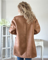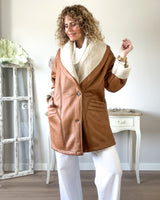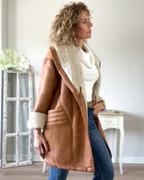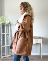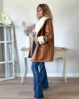 Abrigo largo camel de piel vuelta y borrego interior. Super calentito, con bolsillos y cuello forrado de borrego. Grandes bolsillos delanteros.