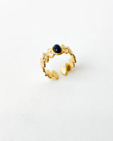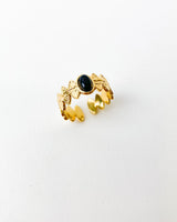 Anillo ancho con formas ovaladas y piedra circular central en color negro. Acero bañado en Oro.