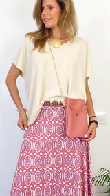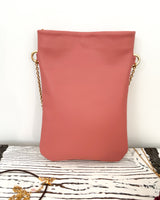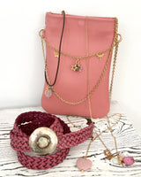Bolso bandolera en piel color rosa claro. Diseño con cadena dorada de estrella y piedras naturales colgando. Cadena dorada para colgar.