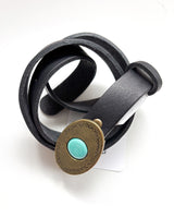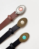 Cinturón piel en color negro. Hebilla con piedra central turquesa en forma redondeada. Corte ancho.