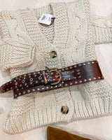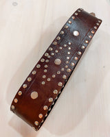 Cinturón ancho de piel en color chocolate. Tachuelas en color plata. Corte ancho.