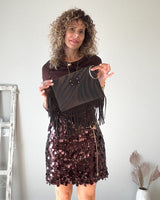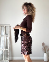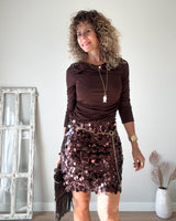 Falda mini color marrón chocolate cón grandes lentejuelas. Corte ajustado ligeramente evasé. Cintura con cremallera lateral y forro interior.