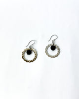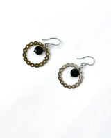 Pendiente largo de aro circular en troquel y piedra oscura.