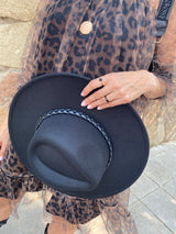 Sombrero en color negro Fedora de fieltro. Detalle de cinta trenzada en color negro.
