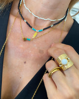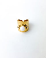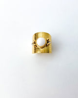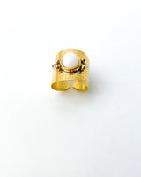 Anillo ancho envolvente en el dedo con bola de color blanca. Acero bañado en Oro.