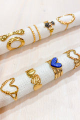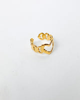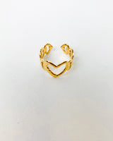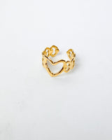Anillo con corazón central y corazones pequeños rodeando el dedo.
