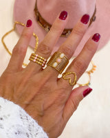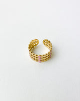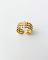 Anillo triple de bolitas con piedra natural rosa redonda. Acero con baño de oro.