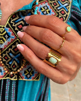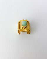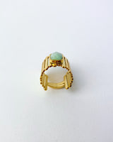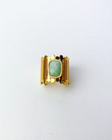 Anillo grueso con pequeña piedra natural verde agua. Acero bañado en Oro.