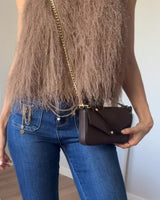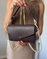 Bolso de pIkea en marrón oscuro. Tamaño cuadrado con agarre de mano y cadena larga.