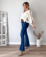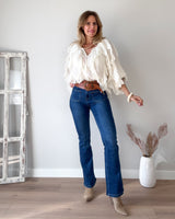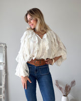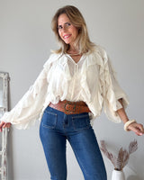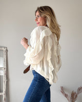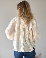 Blusa beige con volantes verticales. Escote pico y abotonada en la parte delantera. Tejido muy vaporoso.