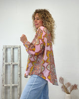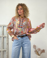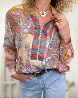 Blusa fluida estampada en colores rosas, azul, crudo, naranjas. Escote pico con cristales en azul y naranja. Línea de perlas en la parte delantera.