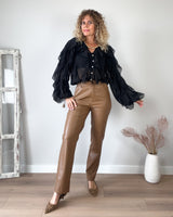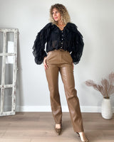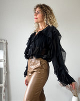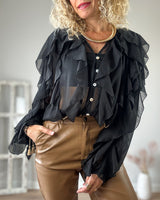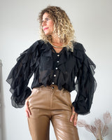 Blusa de volantes de manga larga en color negro. Corte recto y tejido semitransparente.