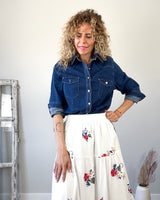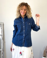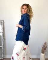 Camisa denim azul con bolsillos delanteros. Cuello so lapa y abotonada en la parte delantera. Corte ajustado y muy elástica.