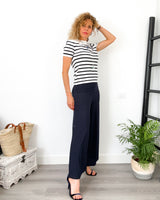 Camiseta blanca con rayas negras. Manga corta. Tipo jersey.