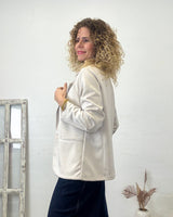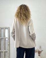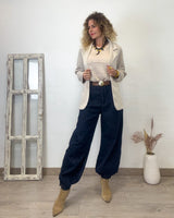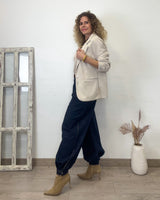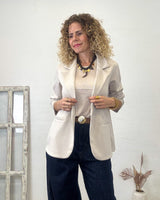 Blázer larga beige de corte suelto con mucha caída. Abrochada con un único botón. Tejido de punto muy suave.