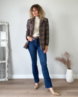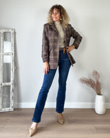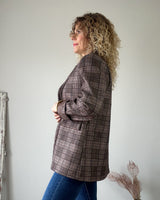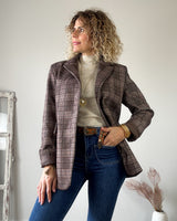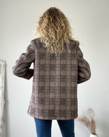 Blazer tostada en marrón de cuadros. Corte recto y bolsillos de plastón. Forro interior. No se arruga.