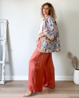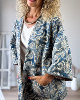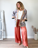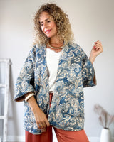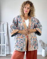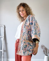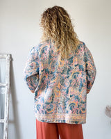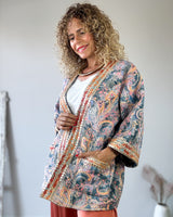 Chaqueta acolchada reversible en tonos melocotón, salmón, azulados… Mangas y parte delantera decorada con motivos étnicos. Bolsillos delanteros y escote pico. Interior reversible en tonos azules y amarillos. Una preciosidad.
