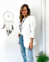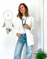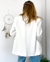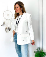 Blazer blanca de corte recto con detalles de broches brillantes en forma de letras.