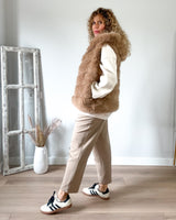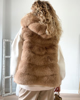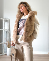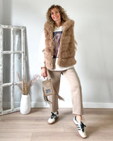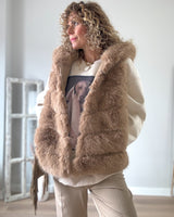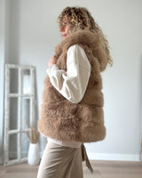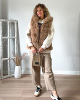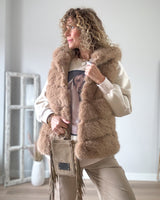 Chaleco camel de pelo y corte recto combinado con polipiel. Bolsillos laterales y capucha. Una opción muy versátil. Forro interior combinado con polipiel.