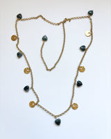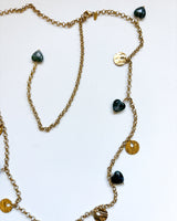 Cinturón de cadena dorada con complementos y charms de corazones verdes y charms dorados. Terminación del cinturón con decoración de pieza y cristal.