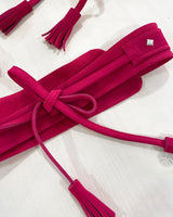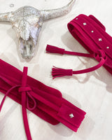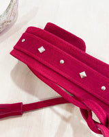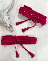 Cinturón de serraje ancho, tipo fajín en color fucsia con tachuelas plata en forma de estrella. Ajustable con cordones terminados en borlas.