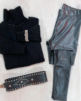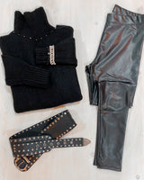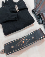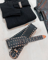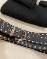Cinturón ancho de piel en color negro. Tachuelas en color plata. Corte ancho.