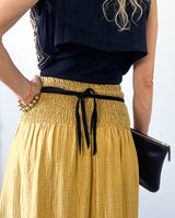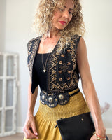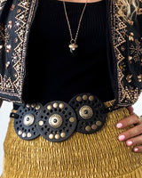 Cinturón ancho tipo fajín de tres piezas labradas y cada una de ellas con piedra negra central. Cordón para ajustar en la cintura.