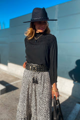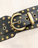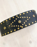 Cinturón ancho de piel en color marrón chocolate. Tachuelas en color dorado. Corte ancho.
