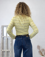 Camiseta amarillo claro cuello barco y tejido elástico rizado. Muy cómoda y estilosa.
