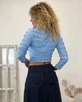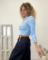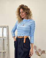 Camiseta azul claro cuello barco y tejido elástico rizado. Muy cómoda y estilosa.