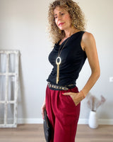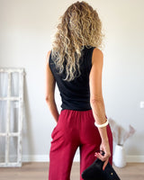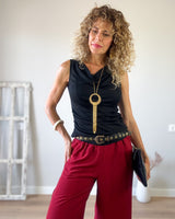 Camiseta negra escote barco y corte ajustado. Drapeada en un lateral. Punto elástico.