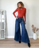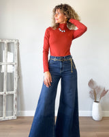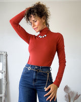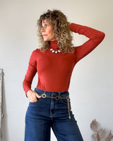 Camiseta body color terracota. Corte muy ajustado con cuello subido y laterales drapeados.