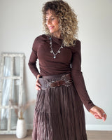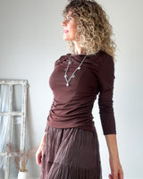 Camiseta marrón chocolate entallada y drapeada en los laterales. Cuello redondo y manga larga.