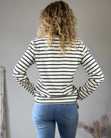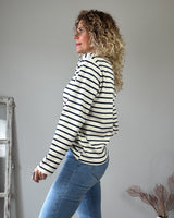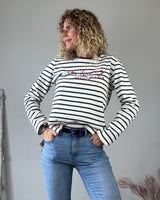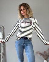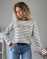 Camiseta beige con rayas negras azules y letras bordadas rojas. Manga larga. Tejido gordito.