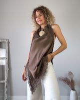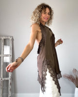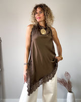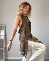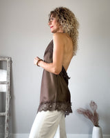 Top lencero marrón café con puntilla y corte pico. Cuello subido y espalda descubierta. Abertura lateral.