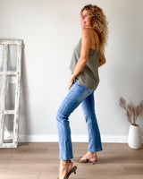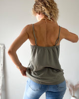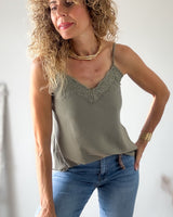 Top lencero color verde oliva con puntilla. Tirante regulable y goma en la espalda.