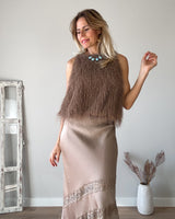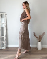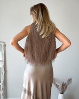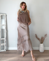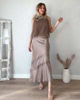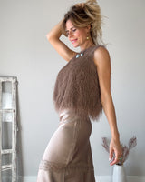 Top de flecos e hilos brillantes de color topo. Sin mangas y de corte midi. Cinturilla fruncida y forro interior. Una preciosidad de top.