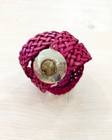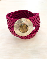 Cinturón fino de piel trenzado en color rosa fucsia. piedra central de color blanca en forma redonda. Corte ancho.