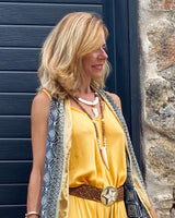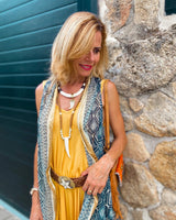 Colgante cuerno color crudo con decoración étnica y detalles dorados. Collar con cadena de cuero fino en color negro.