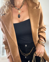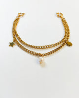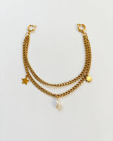Broche de doble cadena con estrellas y perla cultivada. Pequeños mosquetones en cada extremo. Un complemento perfecto para dar un toke a tus looks.