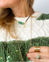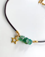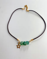 Collar de cordón chocolate y piedra de Agata en verde con detalles dorados, estrella dorado y bolitas doradas.