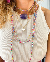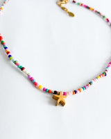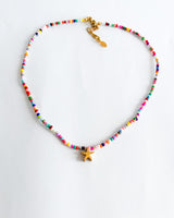 Colgante corto con cuentas de colores y estrella central. Cadena fina. Acero bañado en Oro