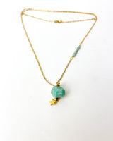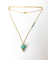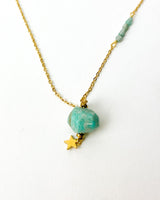 Collar largo con bola de piedra natural de color verde agua y cuentas de color verde. Cadena fina.