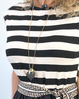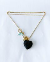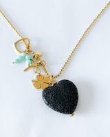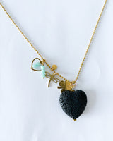 Collar largo de cadena de bolitas en acero con corazón grande volcánico en negro. Complementos de bolas en color turquesa, trébol, corazón y libélula.