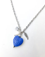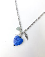 Collar largo de cadena en acero grueso con corazón grande volcánico en azul cielo y complementos de ala, corazón y bolitas blancas.