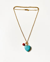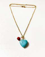 Collar con corazón turquesa y bolitas rojizas. Cadena fina y larga.