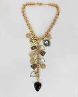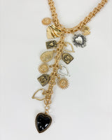 Collar dorado cadena de grandes eslabones, con charms de corazón, moneda y formas en dorado y plateado. Terminado en un corazón negro.