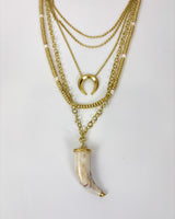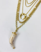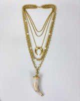 Collar dorado con múltiples cadenas de diferentes grosores. Cuerno principal grande blanco veteado. Precioso collar.