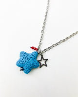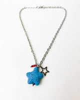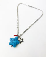 Collar de cadena gruesa y eslabones largos con estrella grande volcánico en azul y cristales rojos junto a estrella.
